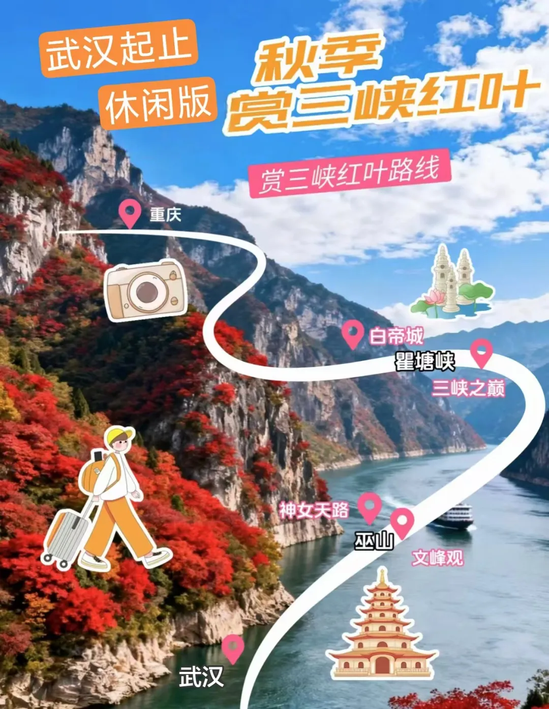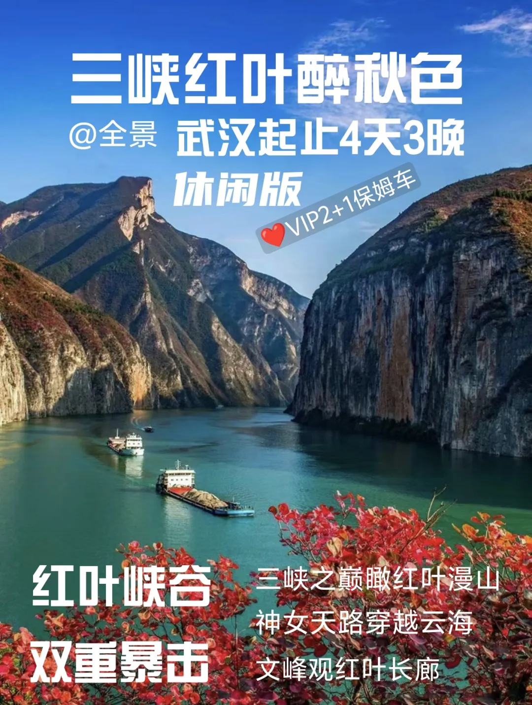 每当三峡红叶季,大家都沉醉流转在网络各大平台的活动召集贴中。但多数朋友止步于看到【徒步爬山线路】几个字,因为对自己的体力无法估量担心适应不了。因此,我们专门组织一期【纯休闲版】的三峡红叶活动,老少皆宜。武汉起止,采用最舒适的VIP2+1保姆车,行程宽松休闲不紧张。