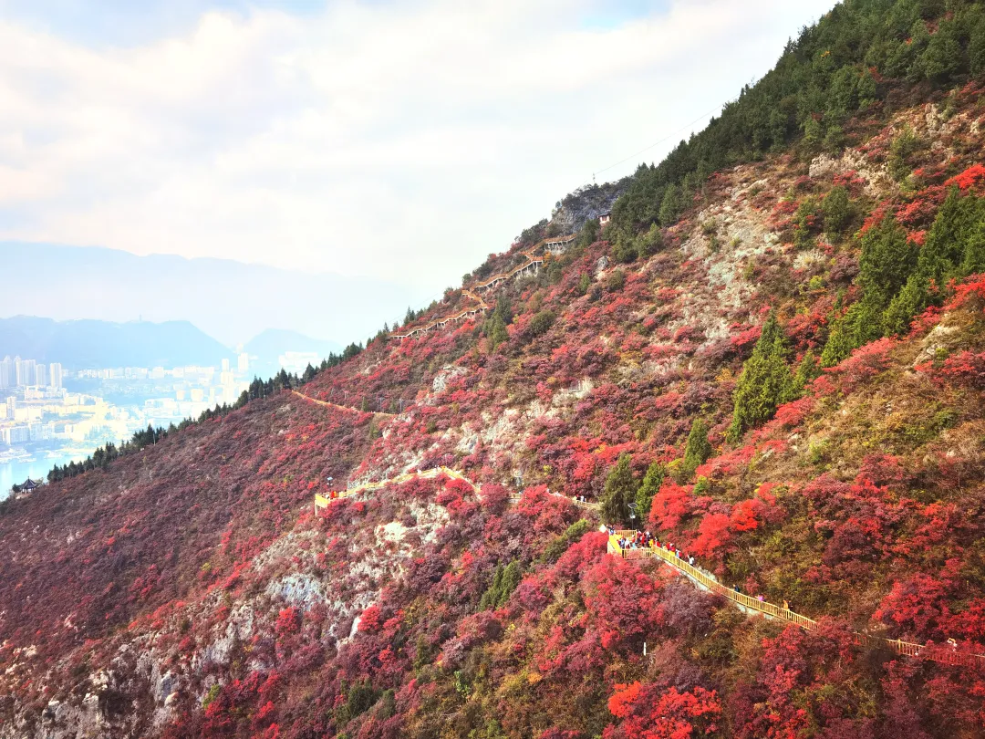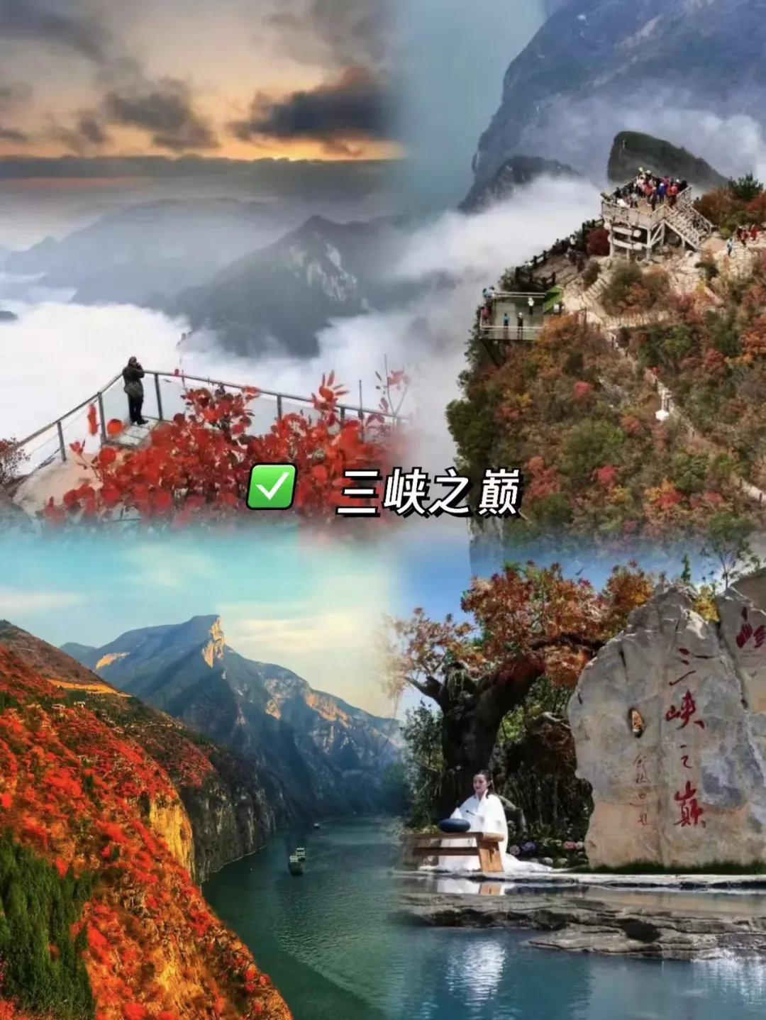 随后我们去【三峡之巅】立长江脊梁之巅,1388米云台尽染赤焰!瞿塘峡八百里江山化作熔炉——夔门为炉口,赤甲山为薪柴,秋霜一点,漫山黄栌、枫香、乌桕轰然燃烧!登临处,江流如碧带蜿蜒,游船似金梭穿行,而脚下千峰叠嶂,正以最炽烈的红向苍穹献祭。