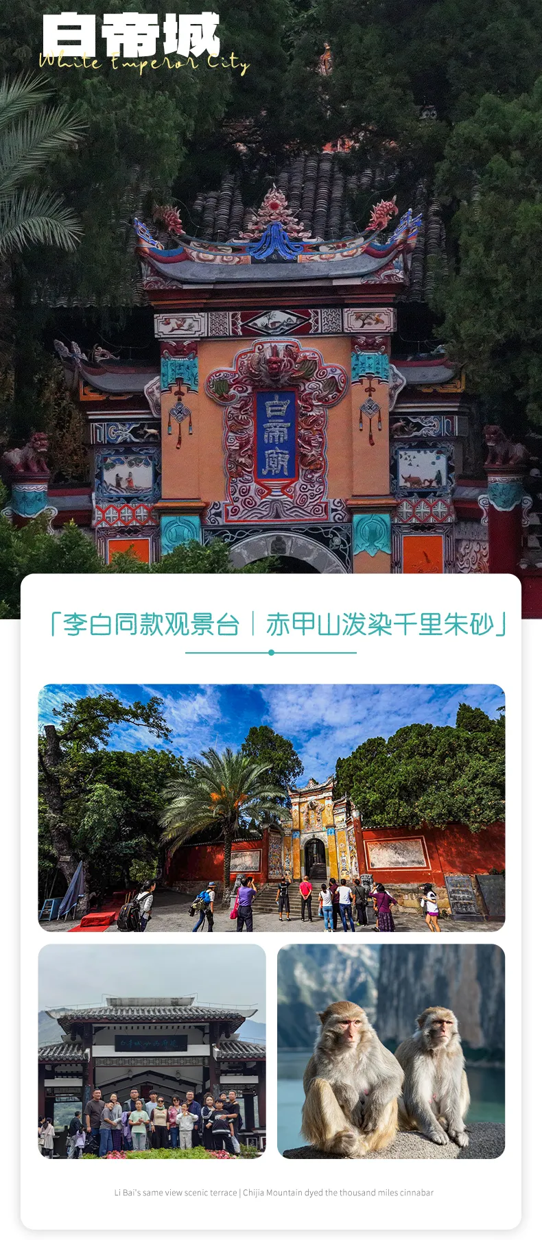 在白帝城,在白帝城,感受一下古诗词的文化魅力。并且还可以了解白帝城托孤的典故,以及喂一喂“两岸猿声啼不住”的后代。最后打卡10元人民币背景——夔门。